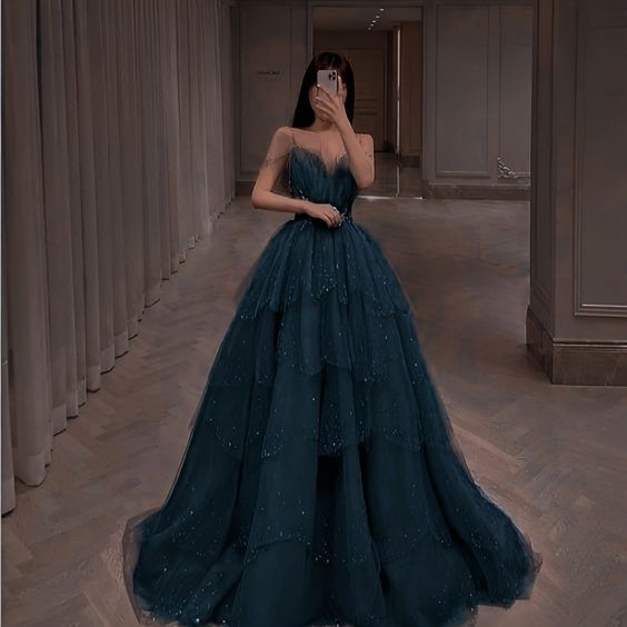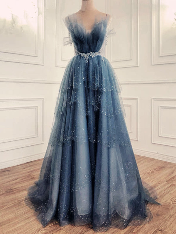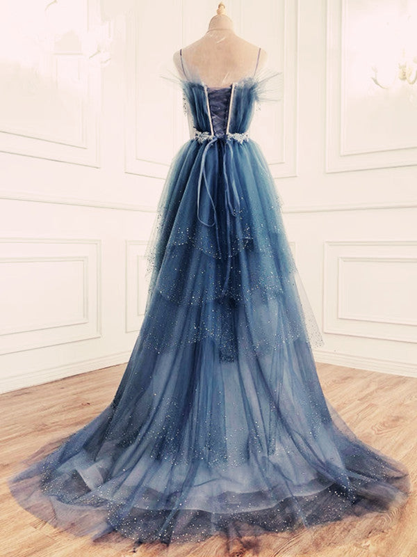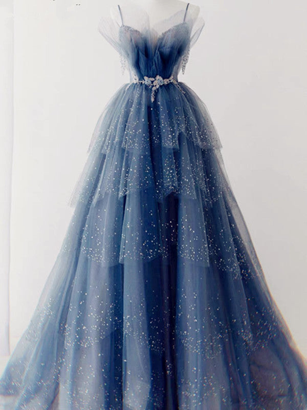 Niulatu Ball Gown Straps Long Tulle Blue Prom Dress HZ1110