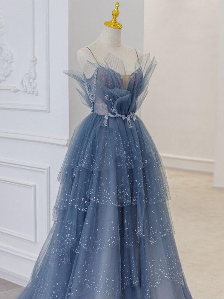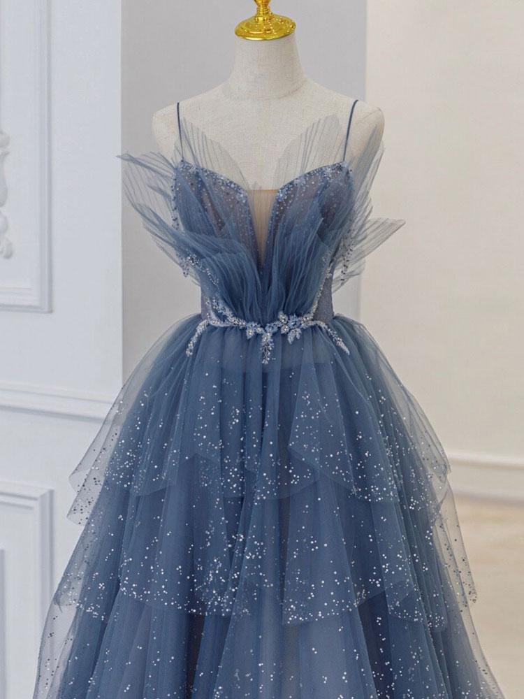 Niulatu blue tulle sequin beads long prom dress, blue evening dress HZ1110