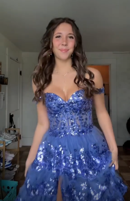 Niulatu Blue Tulle Sequins Layered Evening Dress Formal Slit Prom Dress HZ1007