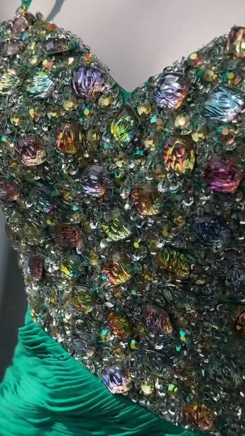 Niulatu Green Spaghetti Strap Chiffon A-Line Sequin Rhinestone Prom Dress Beautiful Bridal Dress HZ1103