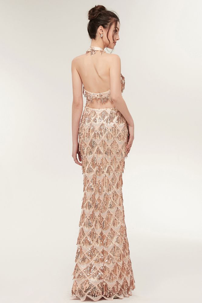 Niulatu Halter Mermaid Long Sequined Patterns Champagne Prom HZ1007