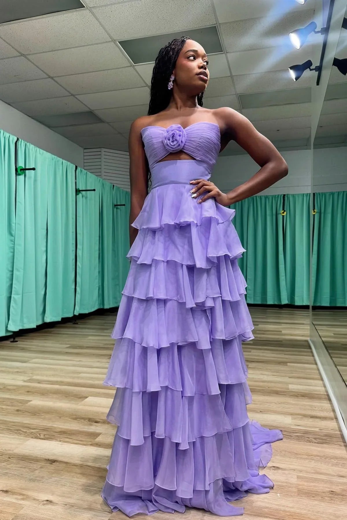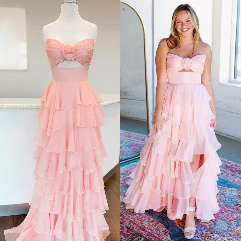 Niulatu Hot Pink A-Line Strapless Chiffon Long Prom Dress Layered Slit Sleeveless Evening Gown HZ1103