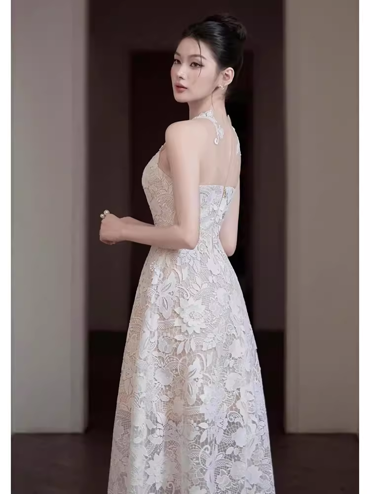 Niulatu Line Scoop Sleeveless Lace White Ankle Length Prom Dress HZ1110