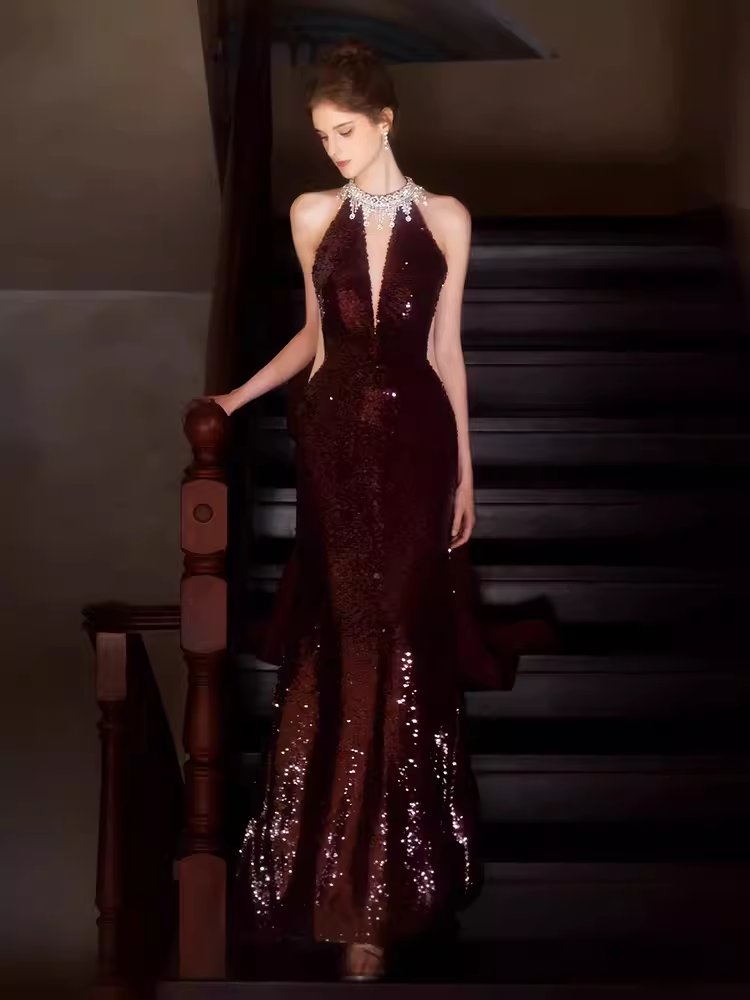 Niulatu Mermaid High Neckline Sequin Burgundy Long Prom Dress HZ1110