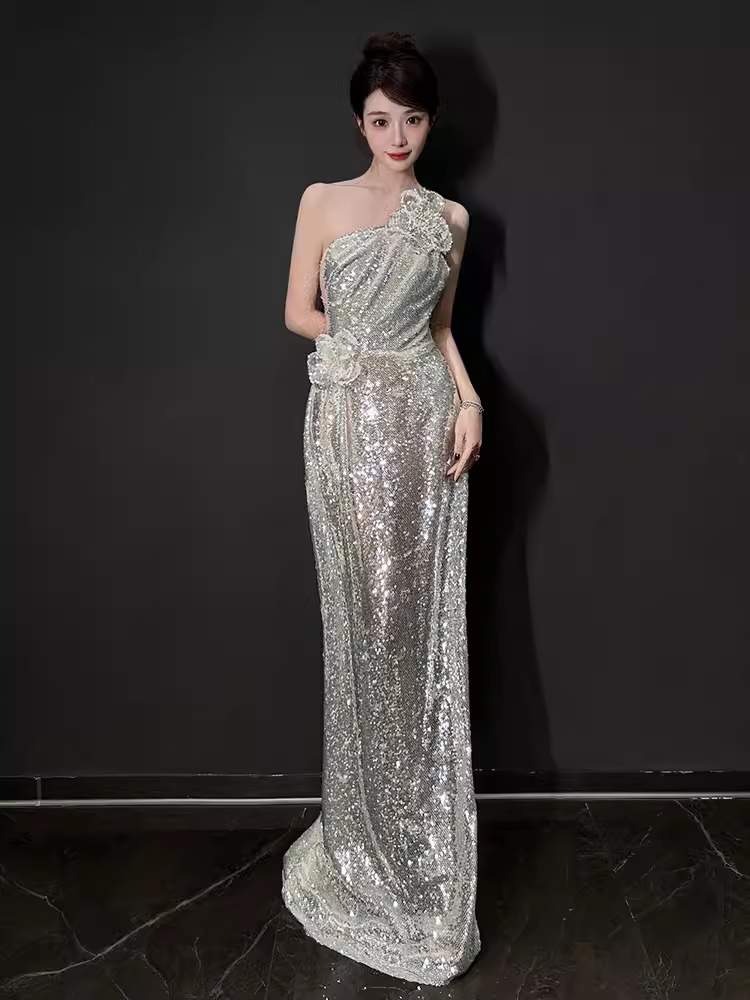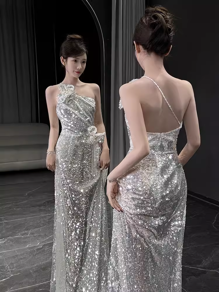 Niulatu Mermaid One Shoulder Silver Sequin Long Prom Dress HZ1110