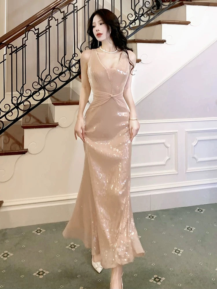 Niulatu Mermaid V Neckline Sequin Champagne Long Prom Dresses Evening Dress HZ1110