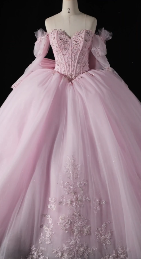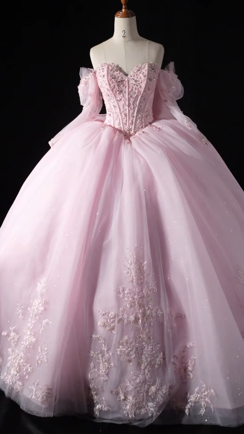 Niulatu Off-the-Shoulder Ball Gown Tulle Long Prom Dresses Beaded Applique Pink Quinceanera Dresses Sweet 16 Dresses HZ1026