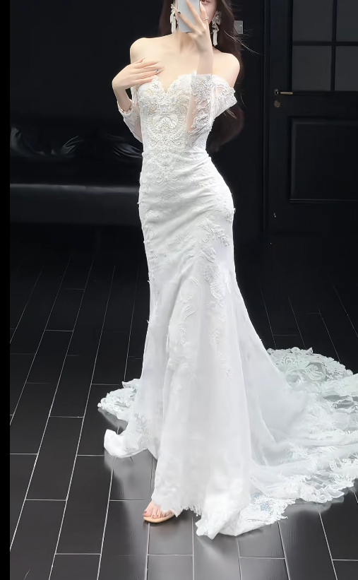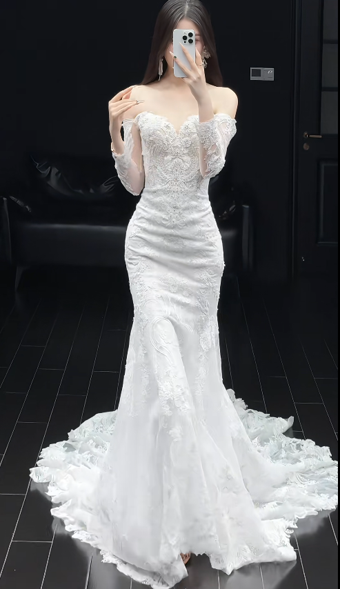 Niulatu Off-the-shoulder Mermaid Wedding Dresses with Train Beading Lace White Bridal Gowns Applique Long Sleeve Bridal Dresses HZ1026