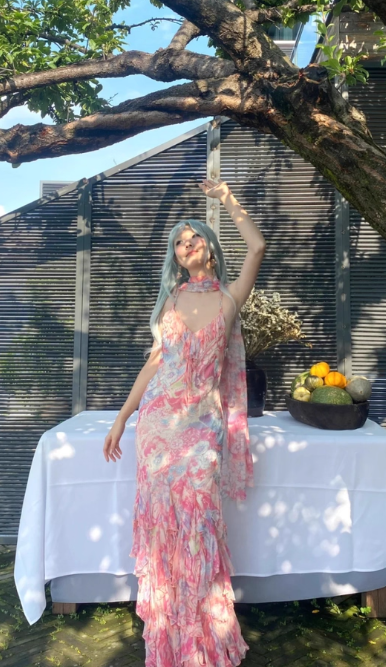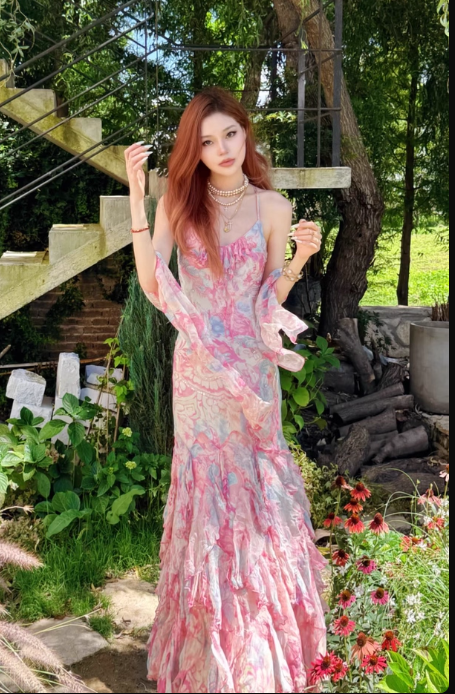 Niulatu Pink Spaghetti Straps Printed Chiffon Mermaid Prom Dresses Vintage Backless Evening Gowns HZ1103