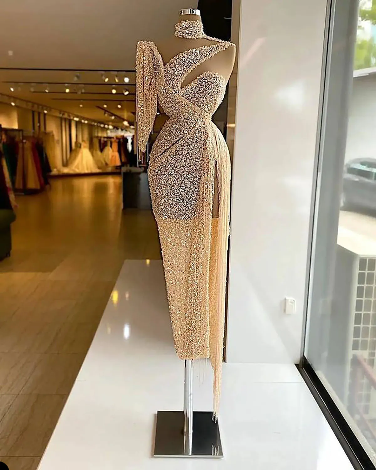 Niulatu Sequin Evening Dress Side Slit Prom Dress One Shoulder Tassels Custom Made HZ1007