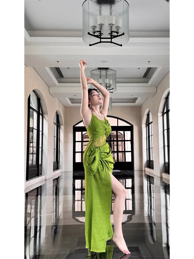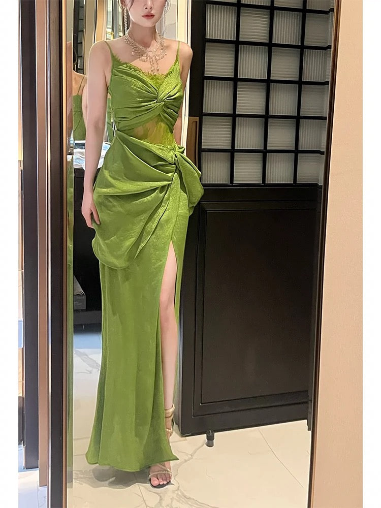Niulatu Sheath Spaghetti Straps Sleeveless Green Slit Prom Dresses Evening Dress HZ1110
