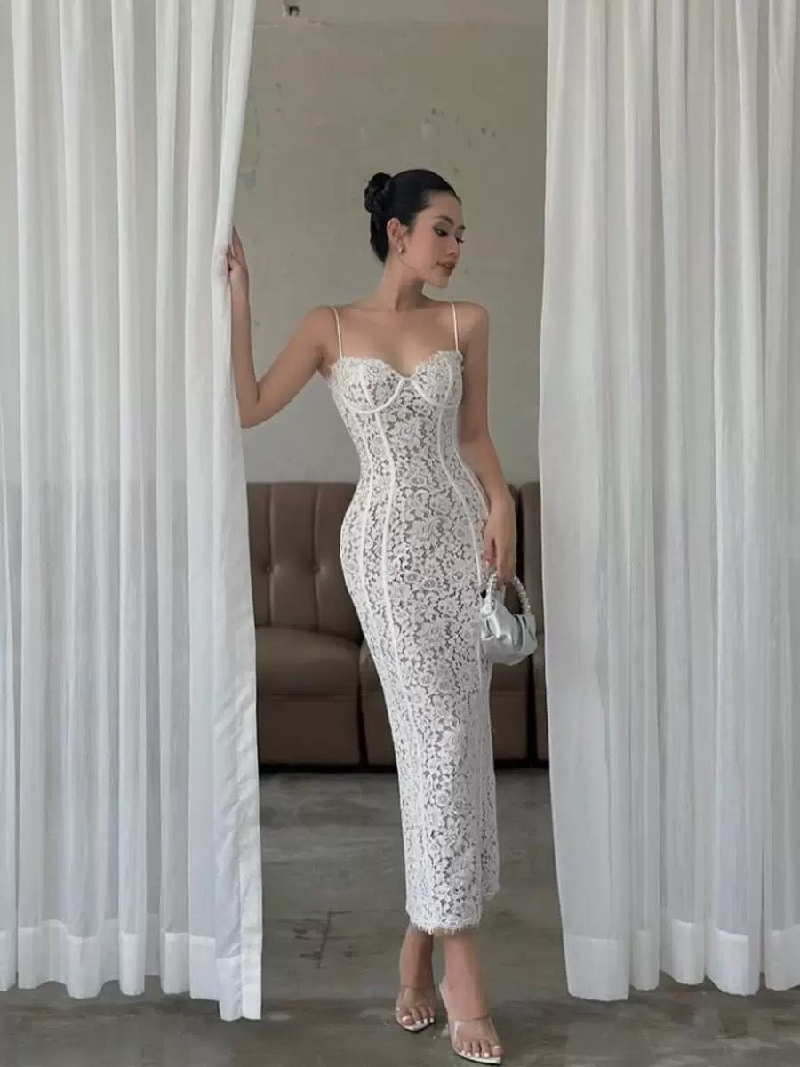 Niulatu Sheath Spaghetti Straps White Lace Ankle Length Prom Dresses Evening Dress HZ1110