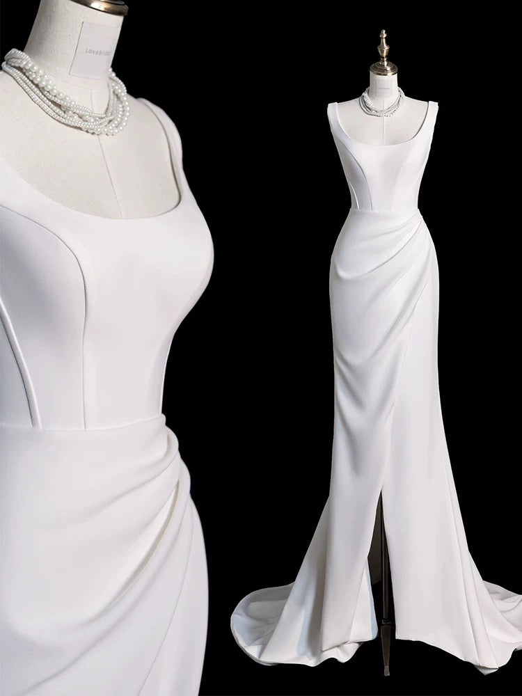 Niulatu Sheath Square Neckline Sleeveless White Satin Slit Wedding Dresses With Ruffles HZ1110