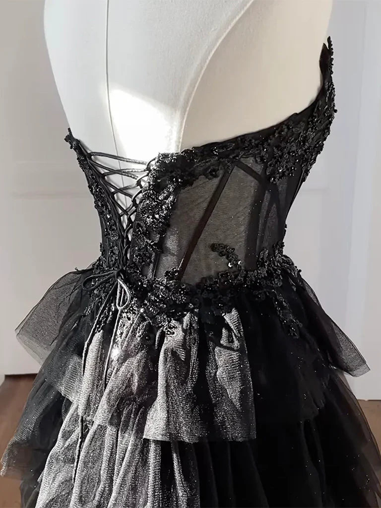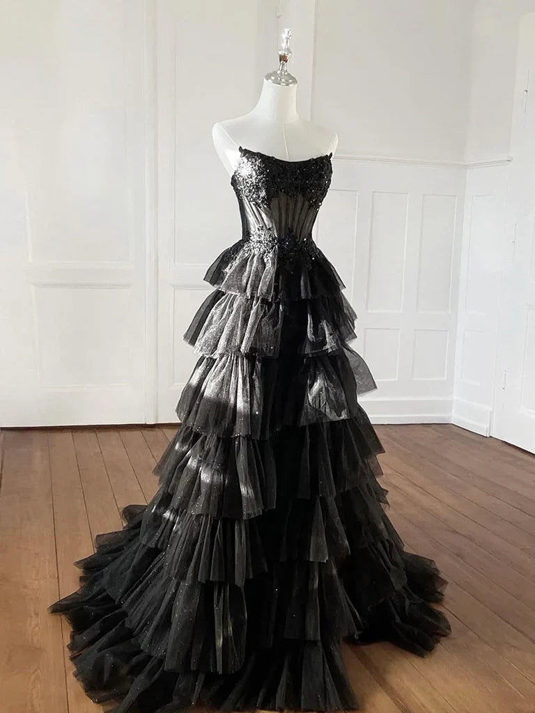 Niulatu Tulle Applique Black Long Prom Dress, Black Long Formal Dress HZ1026