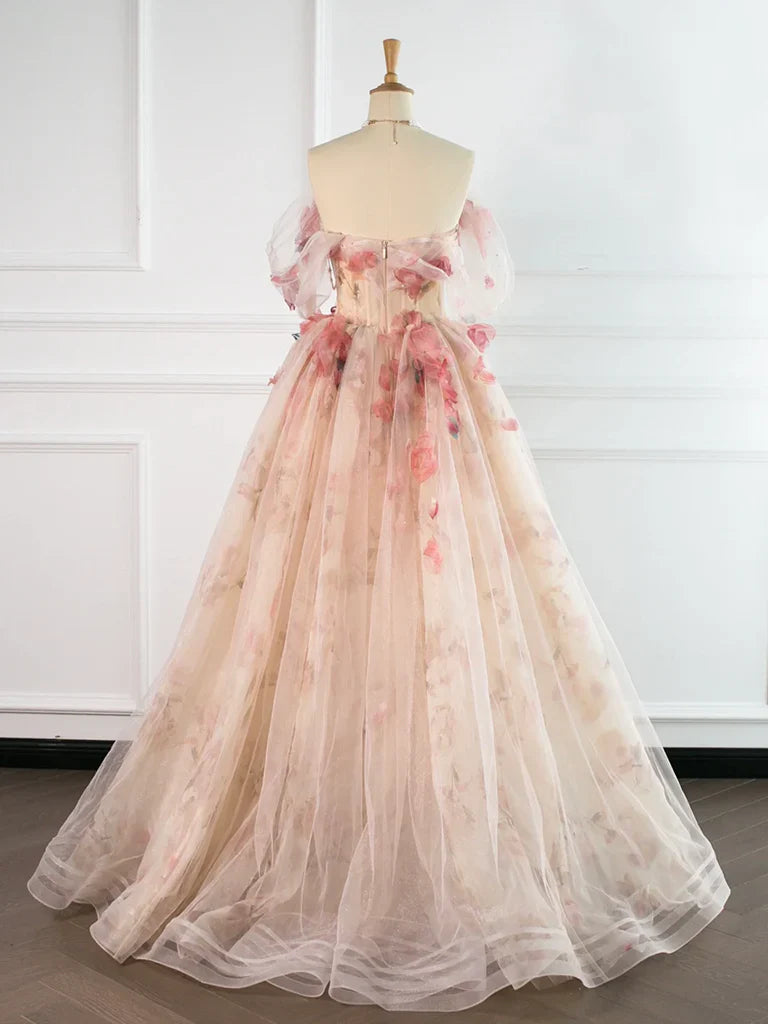 Niulatu Tulle Applique Light Champagne Long Prom Dress, Light Champagne Formal Dress HZ1026