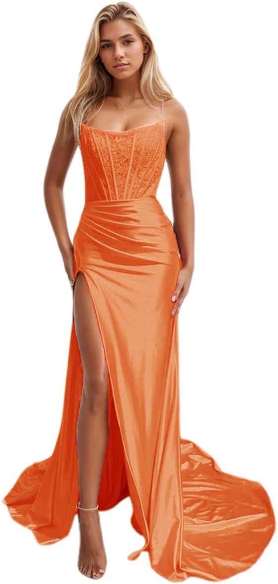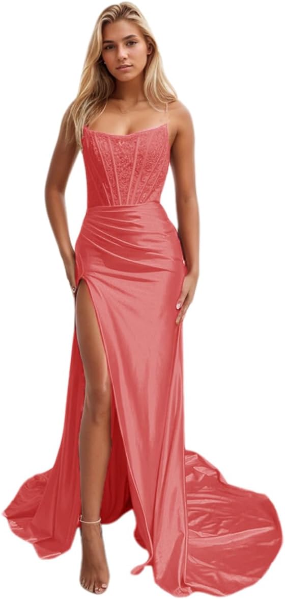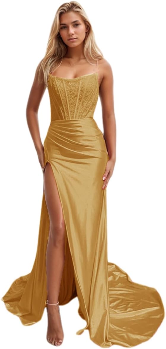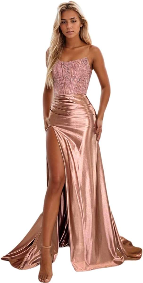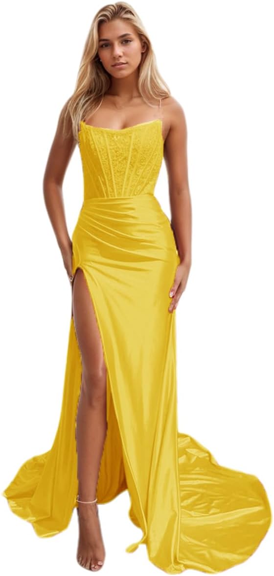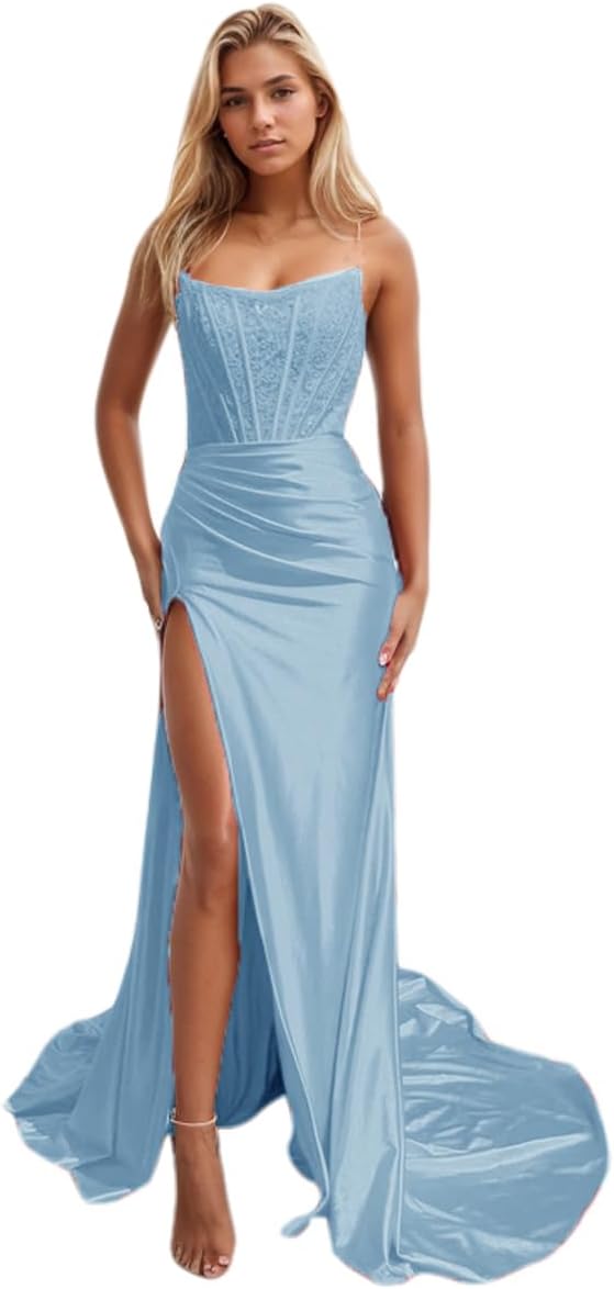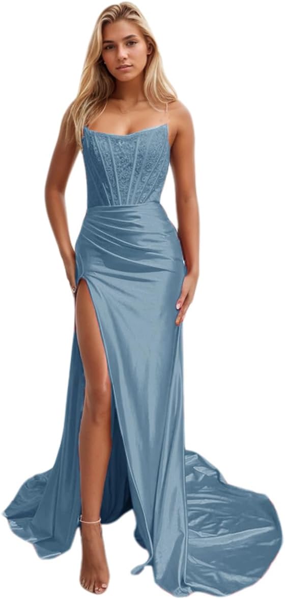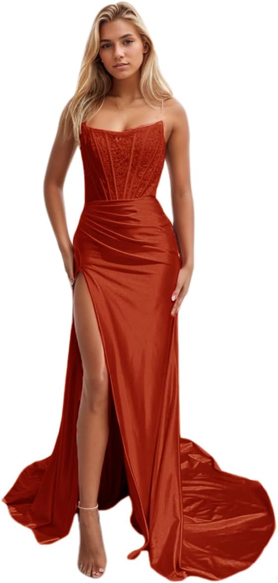 Niulatu Women's Satin Lace Mermaid Prom Dresses Long with Slit 2025 Strapless Formal Evening Party HZ1007