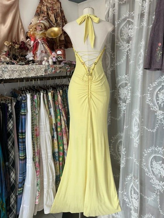 Niulatu Yellow Mermaid Halter Neck Sequin Diamond Long Prom Dress Backless Slit Evening Dress HZ1007