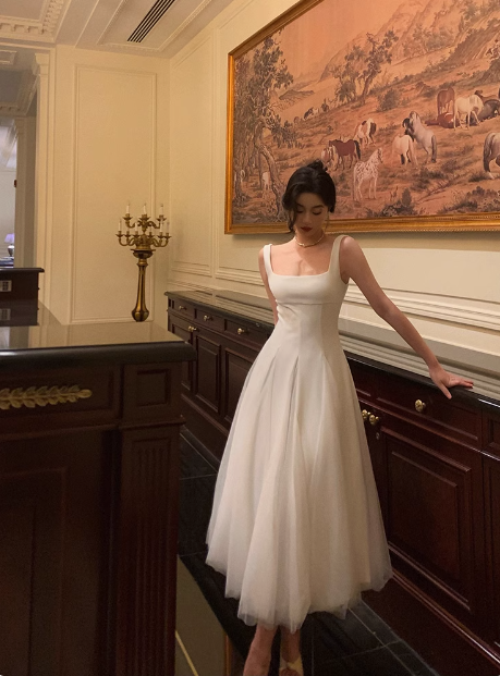 Elegant A line Square neckline Sleeveless White Tulle 21st Birthday Dress Party Gown Birthday Outfits Birthday Dress Ideas For Women HZ1214
