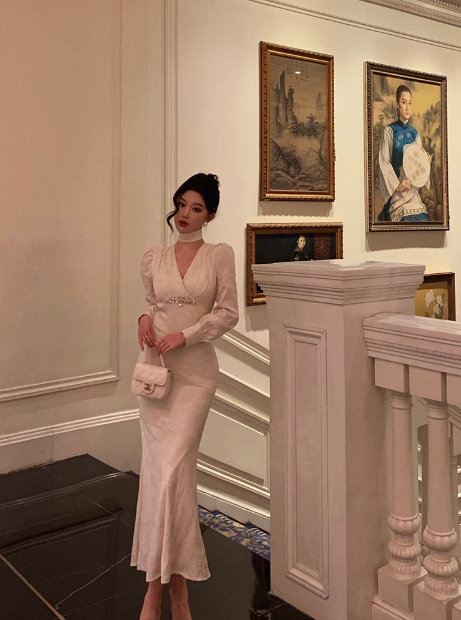 Modest Mermaid V Neck Long Sleeves White Satin 21st Birthday Dress Party Gown Birthday Outfits Birthday Dress Ideas For Women HZ1214