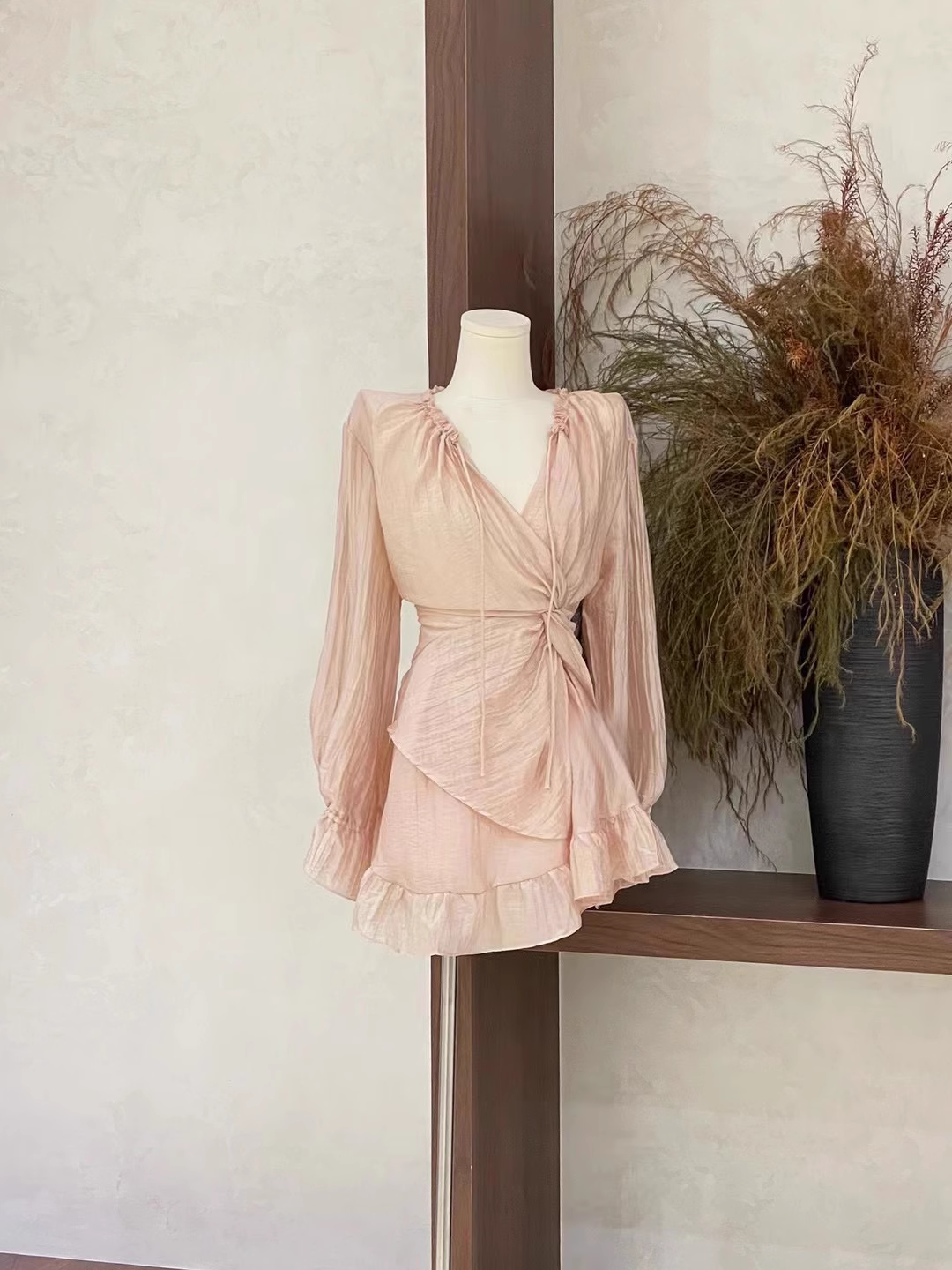 Niulatu 2 Pieces Ruffled Long Sleeves Pink Women's Short Vacation Dresses SD193