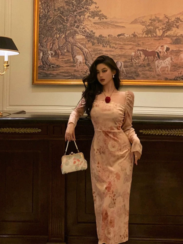 Niulatu A Line Square Neckline Long Sleeves Pink Floral Prom Dresses Birthday Outfits Evening Gown SD921