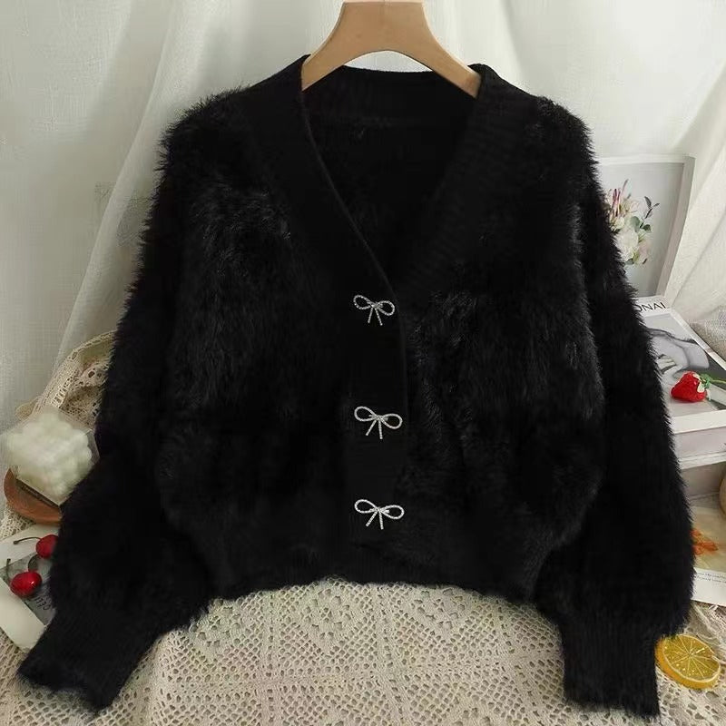 Autumn 2025 Thicken Women's Loose V-Neck Design Sweater Velvet Sweater Jacket Knitted Open Shirt HZ0108