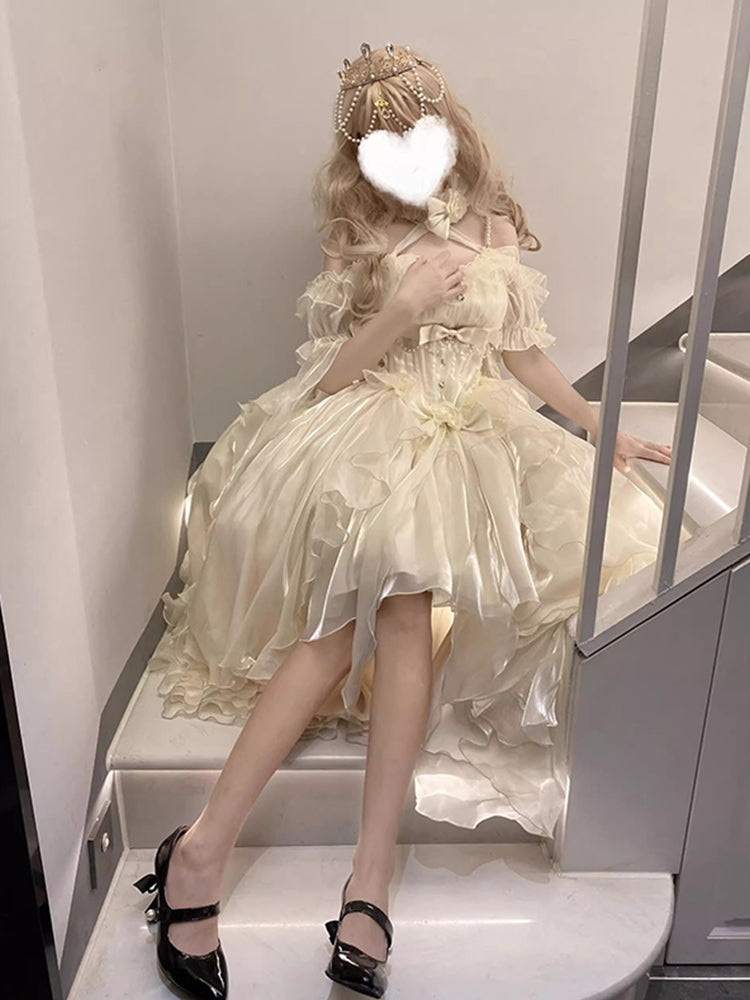 Beautiful High Low Off The Shoulder Short Sleeves Ivory Floral 16th Chiffon Birthday Dress Lolita Dress 18th Birthday Outfits HZ1214