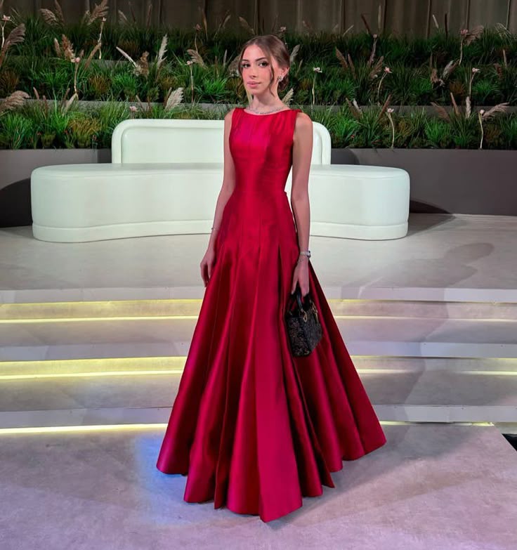 Classy A line Scoop Red Long Satin Formal Prom Gown Summer Wedding Guest Dress Bridal Guest Dresses Wedding Outfits For Guest HZ1121