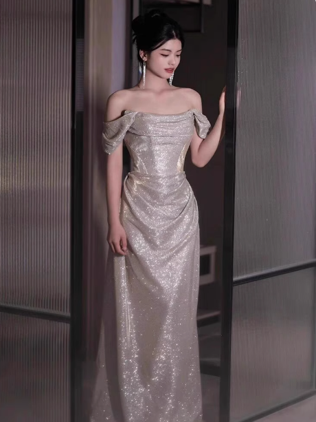Classy Mermaid Off The Shoulder Champagne Sequin Long Prom Dresses Formal Gown Summer Wedding Guest Dresses Wedding Guest Outfit HZ1214