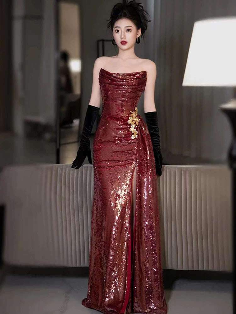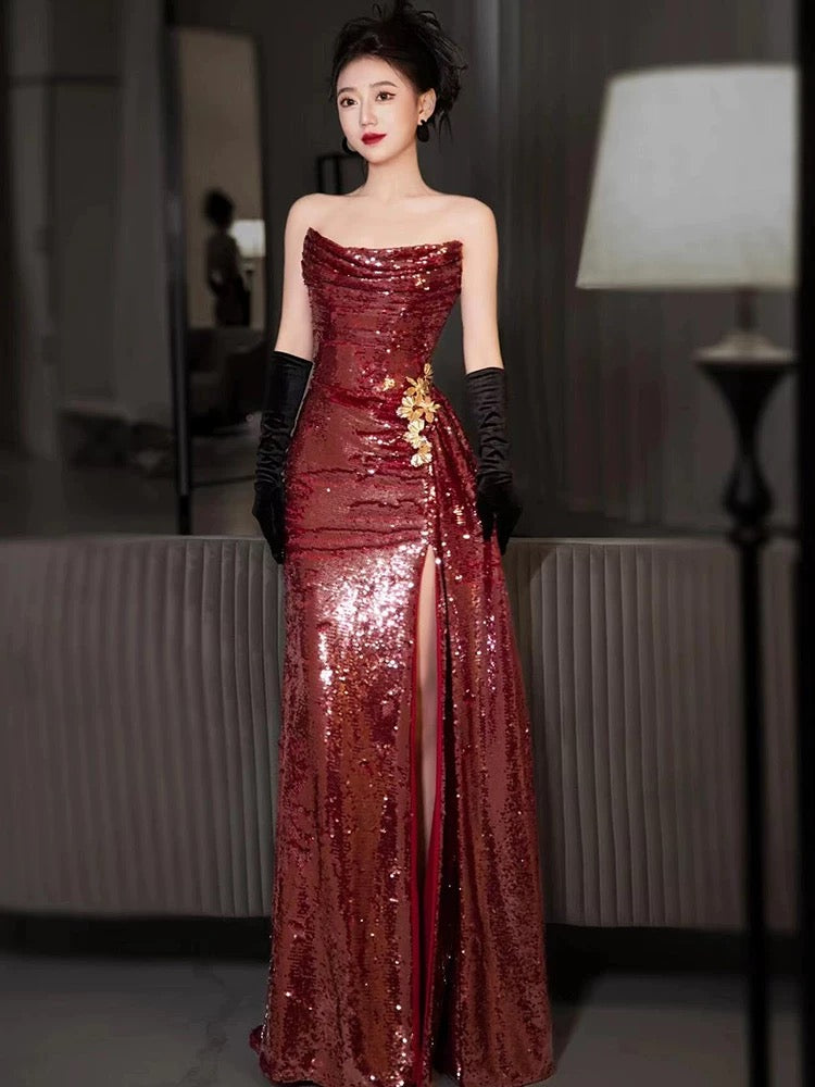 Classy Mermaid Strapless Burgundy Sequin Slit Long Formal Gown Summer Wedding Guest Dress Bridal Guest Dresses Wedding Outfits For Guest HZ1214