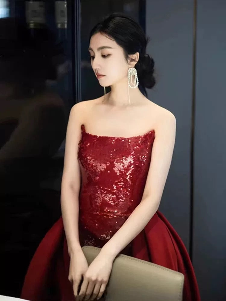 Classy Mermaid Strapless Burgundy Sequin Slit Long Prom Gown Summer Wedding Guest Dress Bridal Guest Dresses Wedding Outfits For Guest HZ1214
