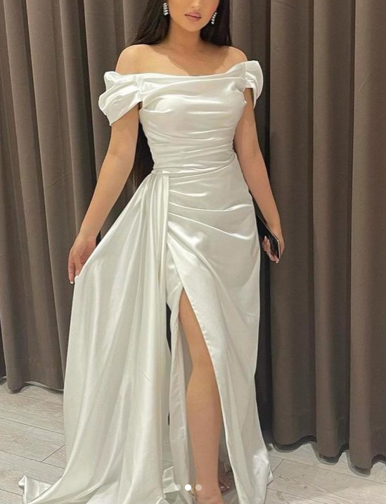 Classy Sheath Off The Shoulder White Slit Formal Long Prom Gown Summer Wedding Guest Dress Bridal Guest Dresses Wedding Outfits For Guest HZ1214
