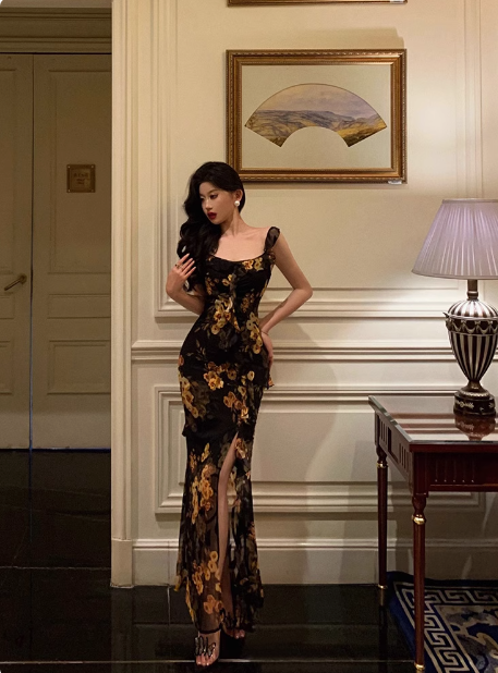 Elegant Mermaid Black Floral Chiffon 18th Birthday Dress Party Gown Birthday Outfits Birthday Dress Ideas For Women HZ1214