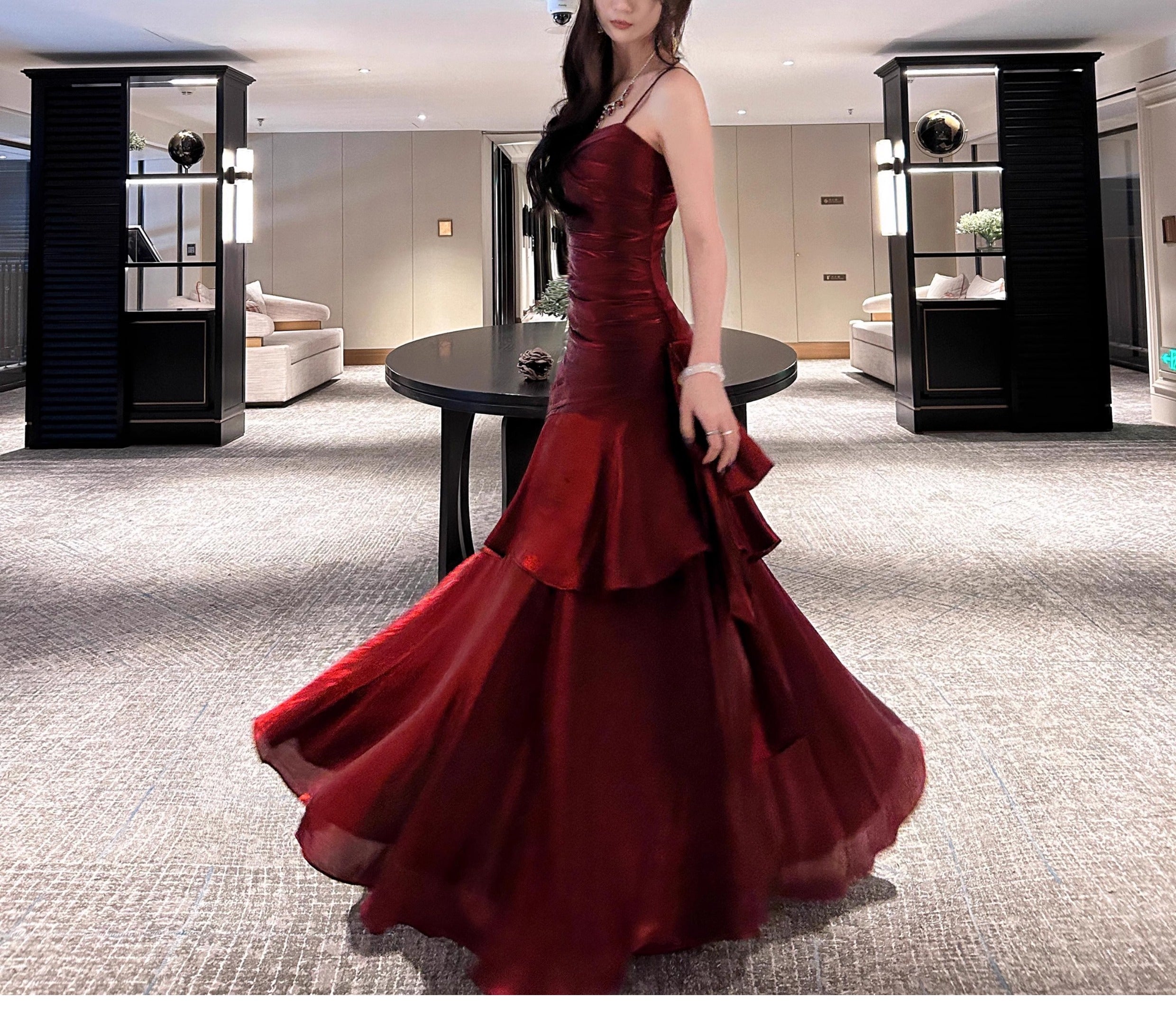 Elegant Mermaid Spaghetti Straps Sleeveless Dark Red Burgundy Long Evening Dress Prom Dresses HZ1214