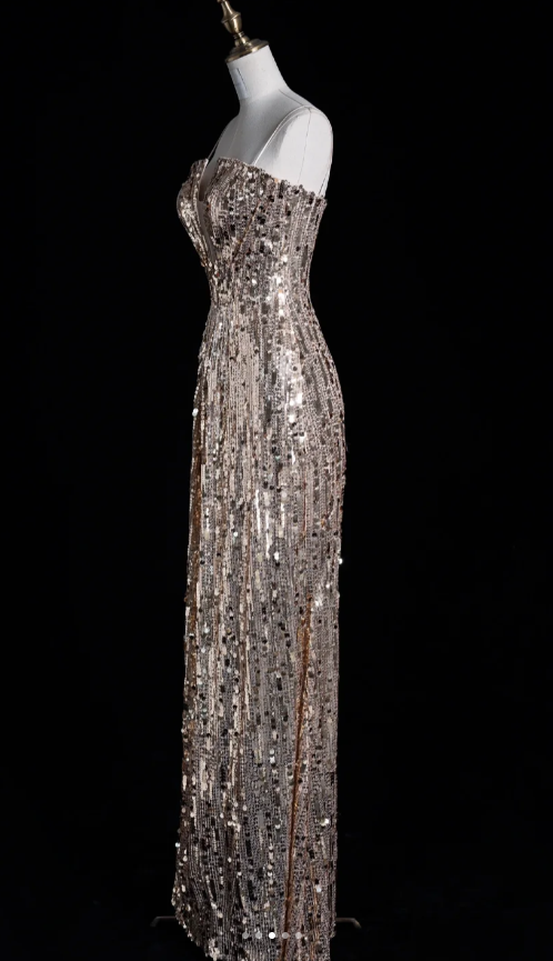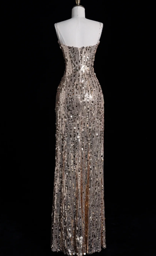 Elegant Spaghetti Strap Sheath Long Prom Dresses Sequins Champagne Evening Dresses HZ1121