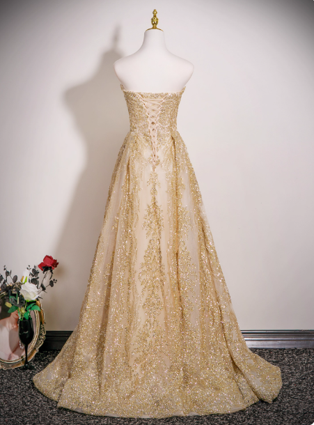 Gorgeous Strapless A-Line Long Evening Dresses Tulle Gold Prom Dresses HZ1121