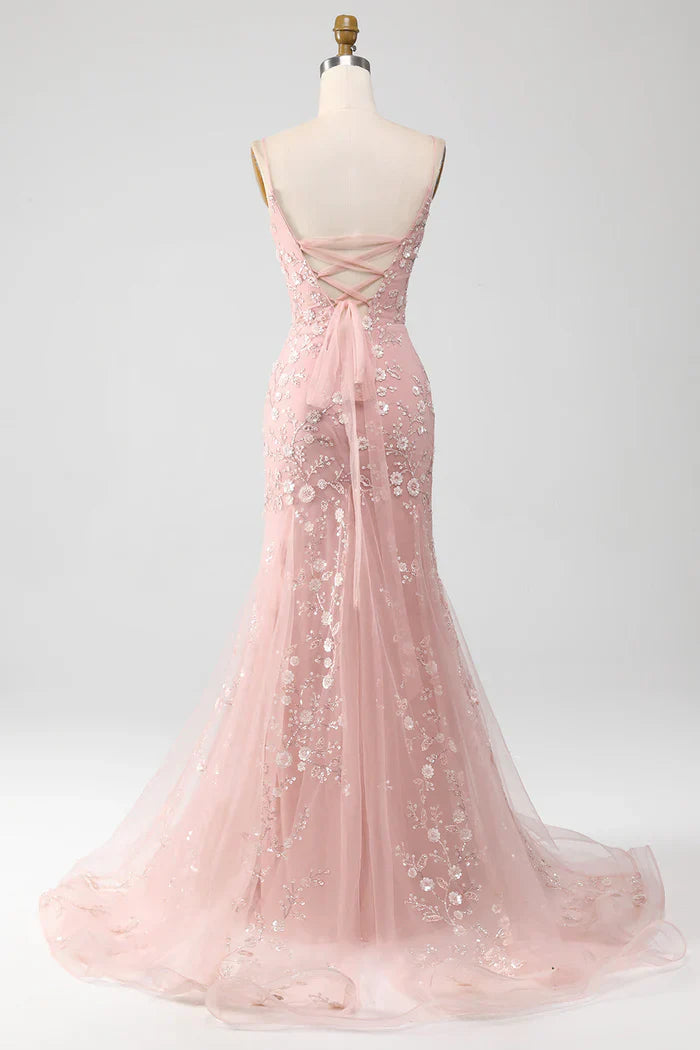 Mermaid Blush Spaghetti Straps Prom Dress With Appliques Evening Dresses HZ1214