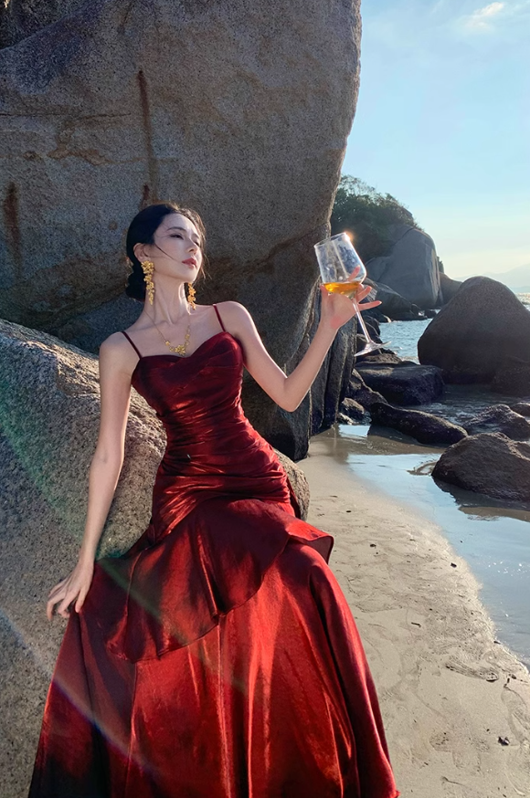 Modest Mermaid Spaghetti Straps Sleeveless Maroon Red Long Evening Dress Prom Dresses HZ1214