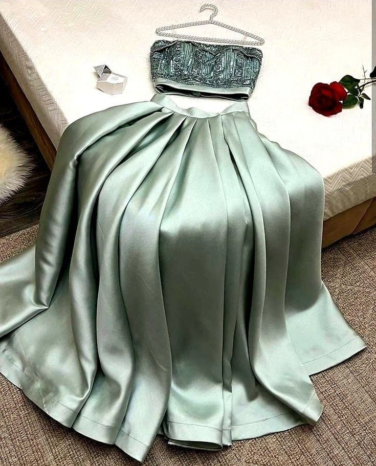 Niulatu A Line 2 Pieces Strapless Mint Green Satin Long Prom Dress Evening Dresses With Beads HZ1110