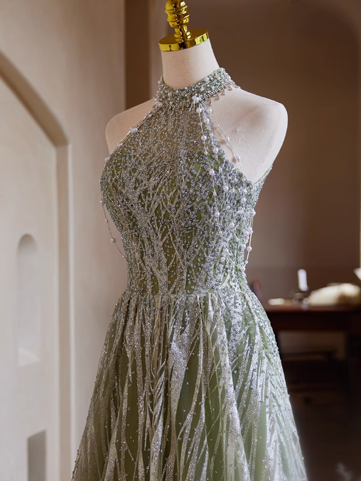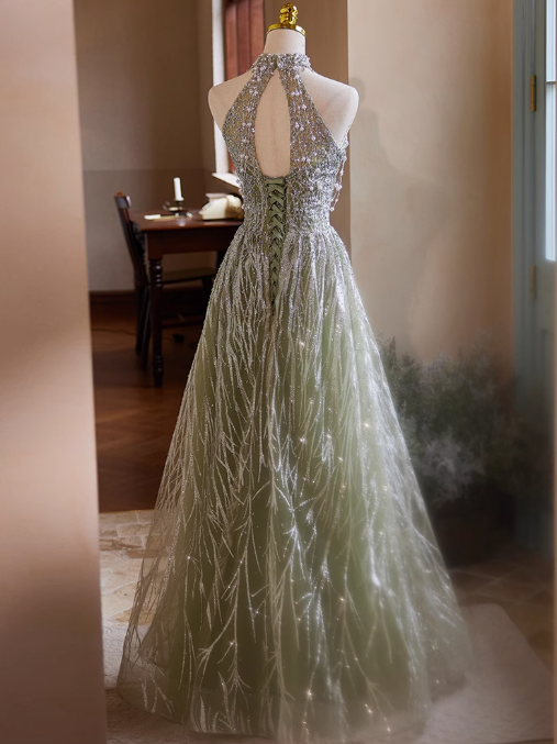 Niulatu A-line Halterneck Tulle Sequins Long Prom Dress, Beaded Evening Dress HZ1103