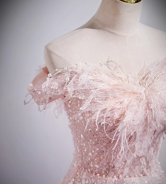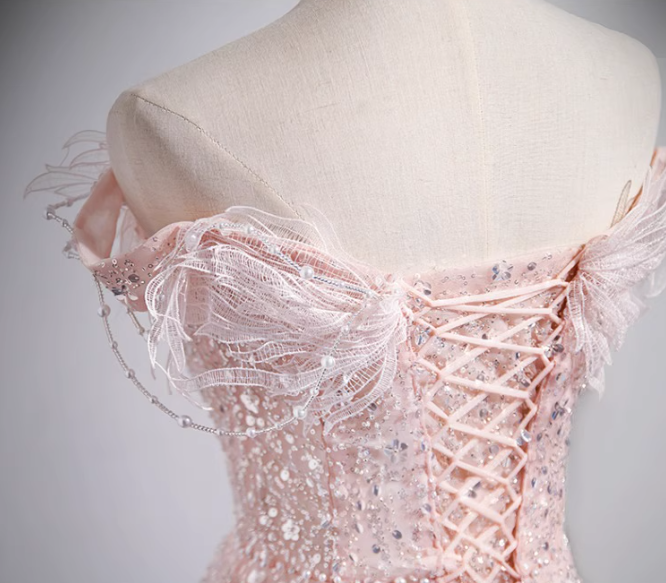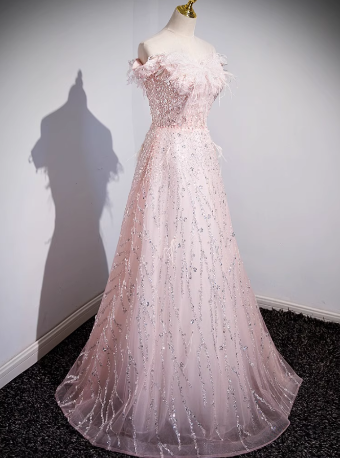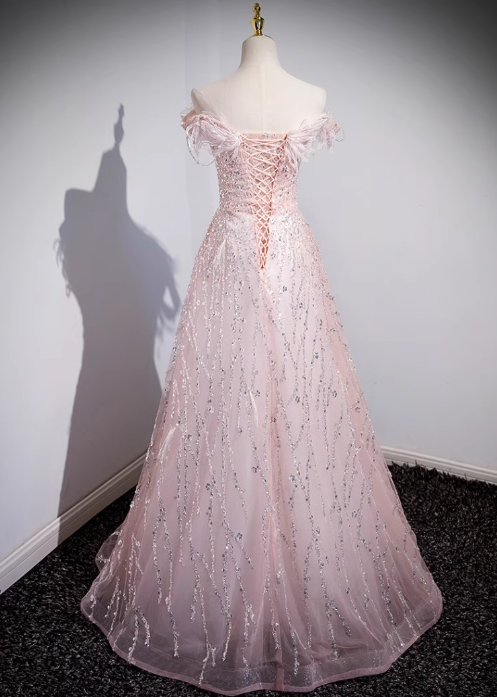 Niulatu A-line off-the-shoulder tulle lace sequined long prom dress, pink evening dress HZ1108