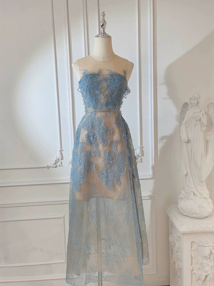 Niulatu A line Scoop Neckline Lace Blue Prom Dress Evening Dresses HZ1110