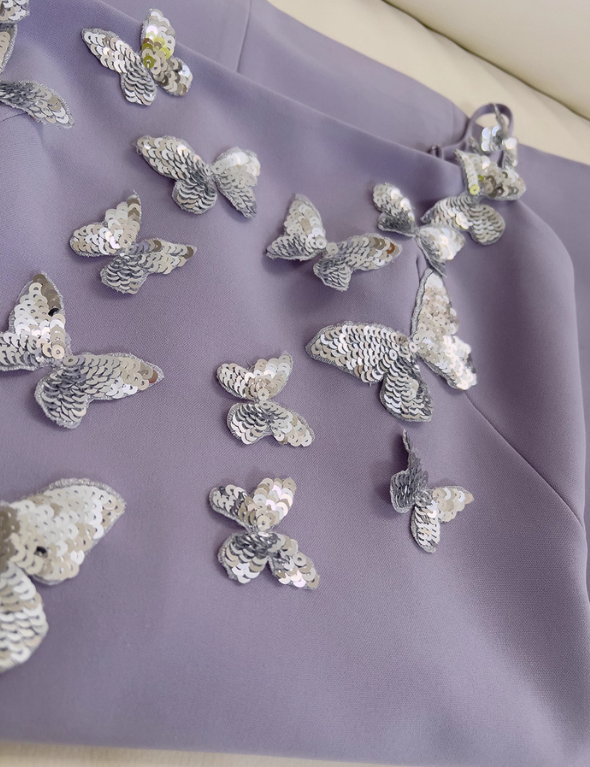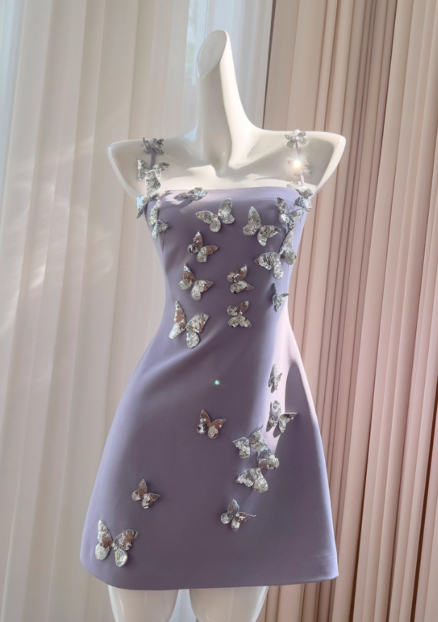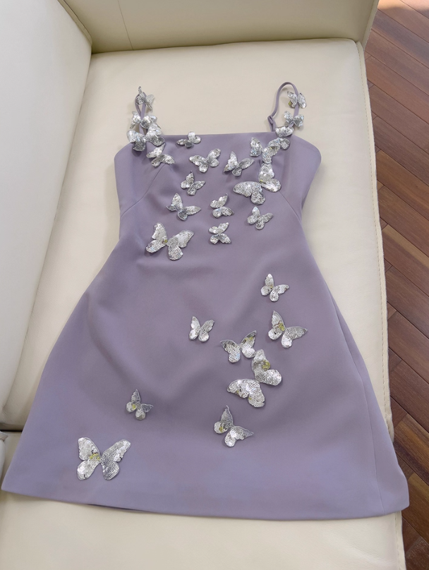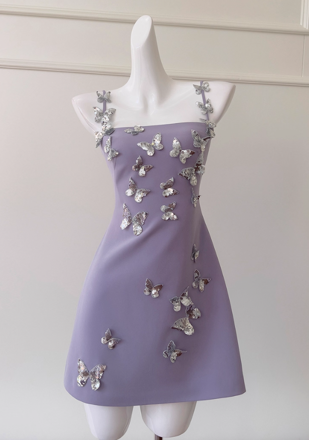 Niulatu A Line Spaghetti Strap Silver Sequin Butterfly Satin Homecoming Dress HZ0113
