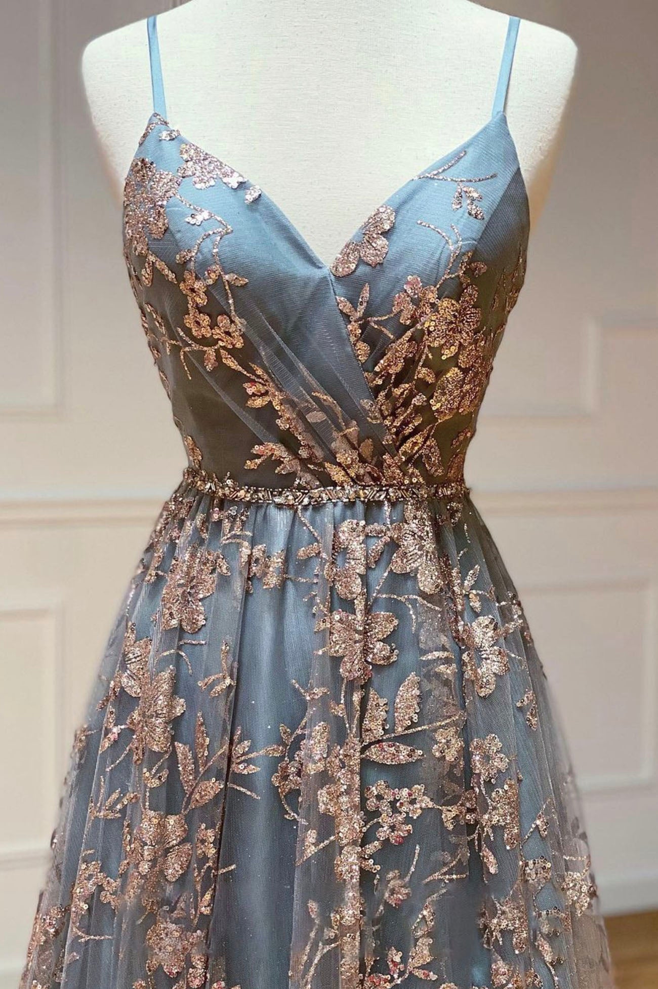 Niulatu A-Line Spaghetti Strap Tulle Long Prom Dress Sequins Evening Gown with Slits HZ1103
