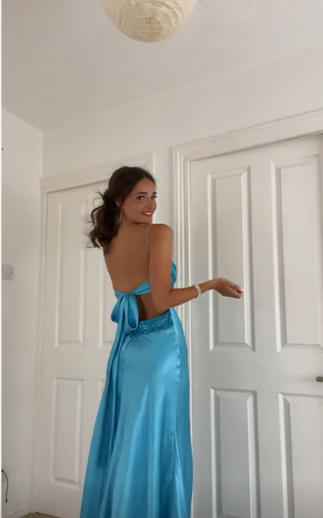 Niulatu A Line Spaghetti Straps 90s Blue Prom Dresses Evening Gowns With Bow HZ1110
