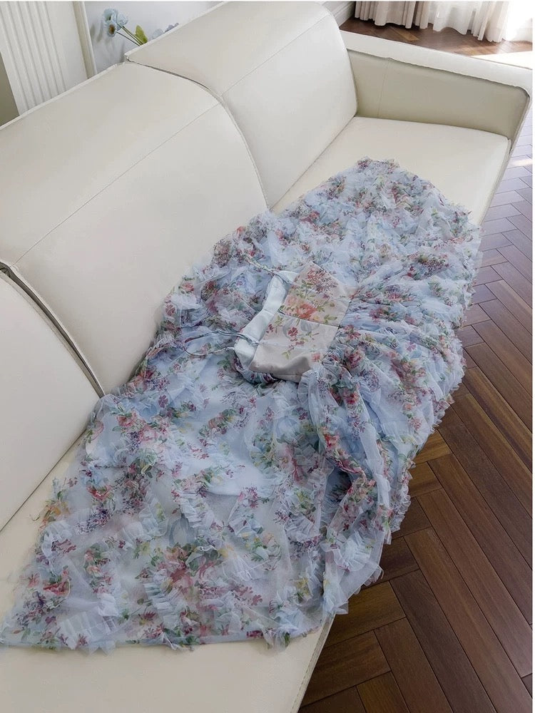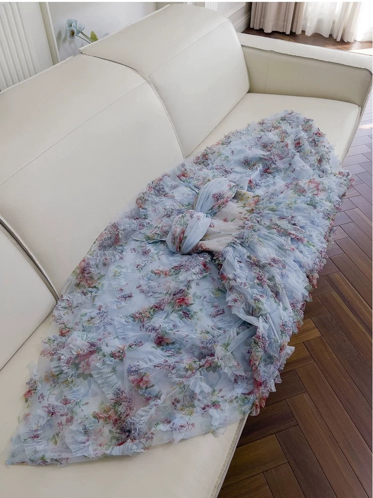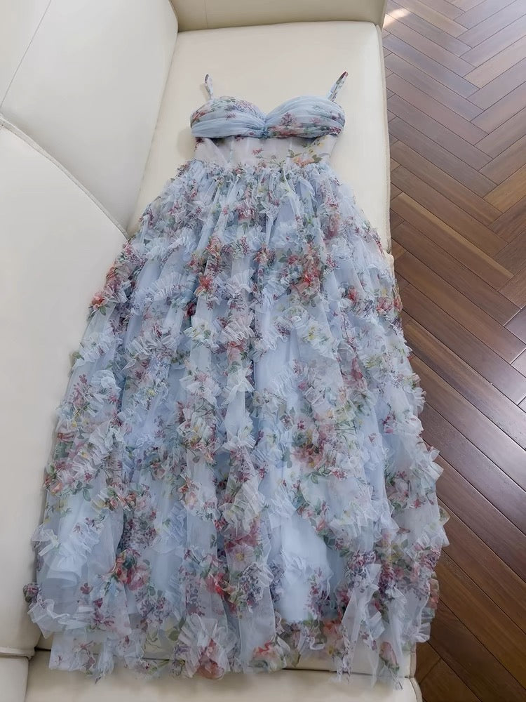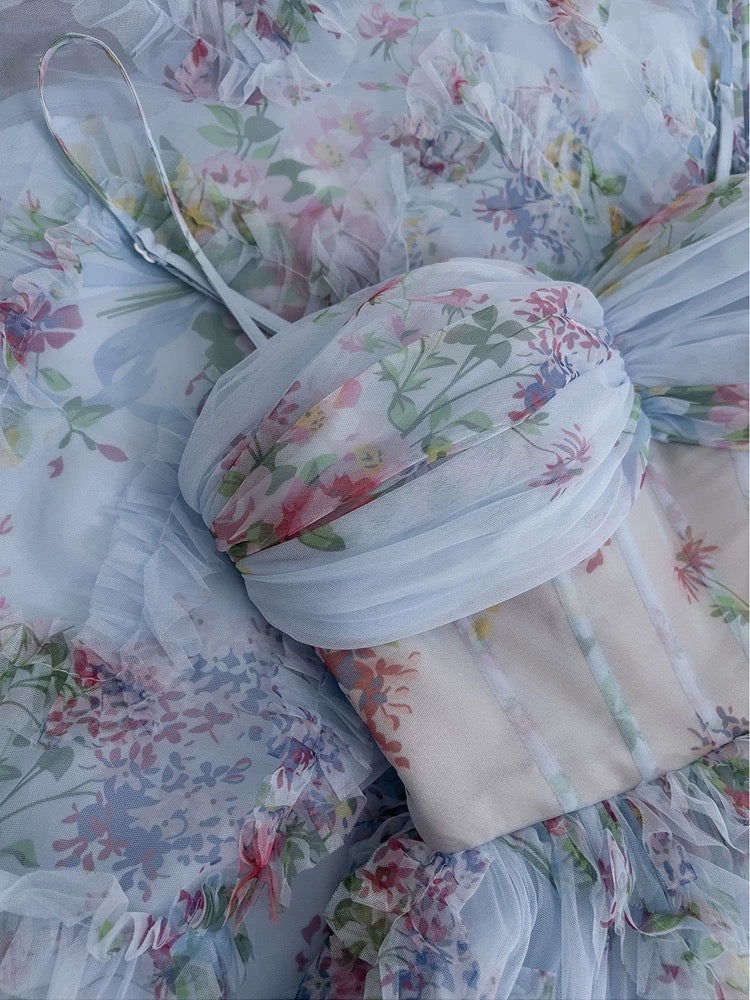 Niulatu A line SPaghetti Straps Prom Dresses Floral Blue Tulle Evening Dress HZ1110