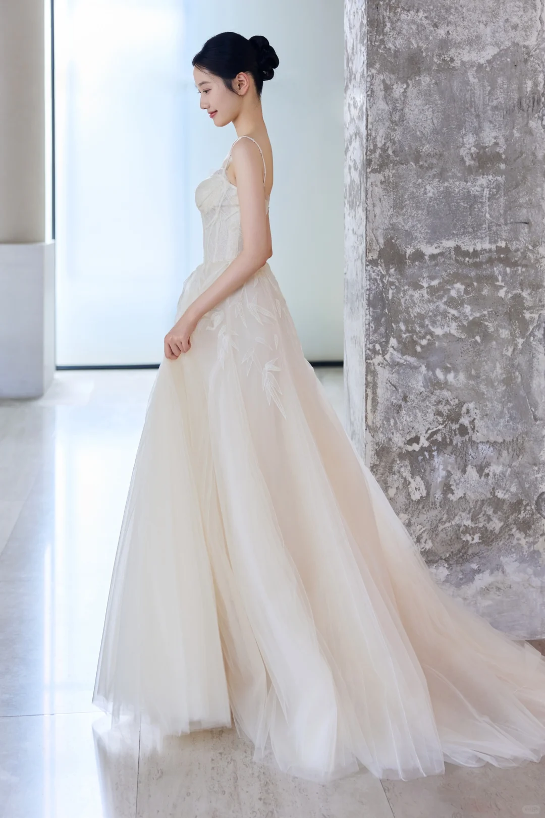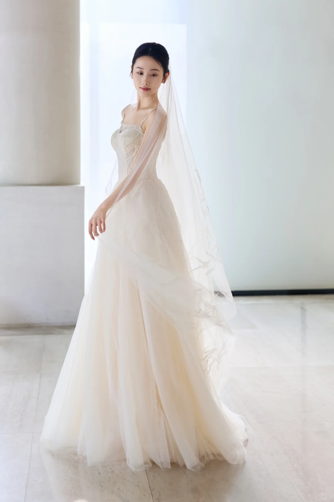 Niulatu A Line Spaghetti Straps Tulle Applique Long Wedding Dresses HZ1110