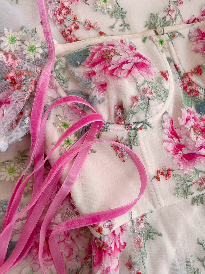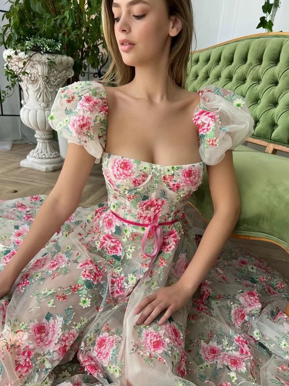 Niulatu A Line Square Neckline Short Sleeves Lace Floral Pink Long Length Prom Dress Formal Dresses HZ1110