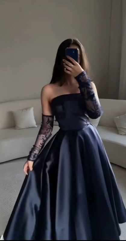 Niulatu Ball Gown Navy Blue Strapless With Long Sleeves Prom Dresses Long Evening Dress HZ1110