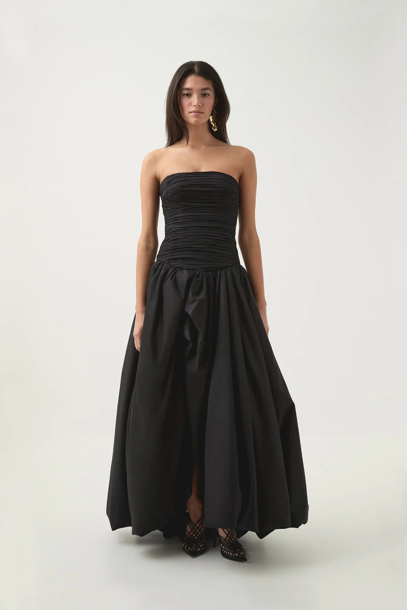 Niulatu Ball Gown Strapless Black Satin Long Prom Dresses With Ruffles Evening Dress HZ1110